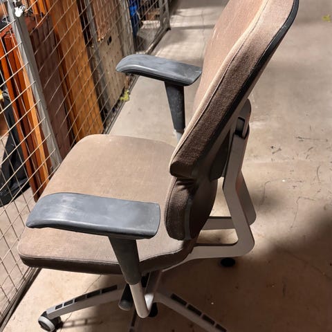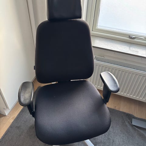 Kontorsstol med svart tygklädsel, justerbara armstöd och nackstöd. Stolen är utformad för att ge stöd och komfort vid skrivbordsarbete.