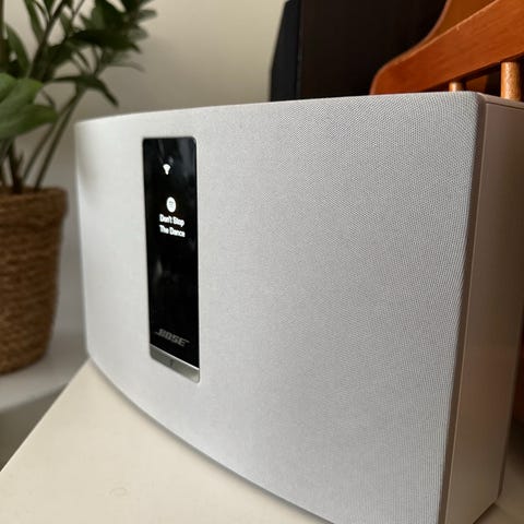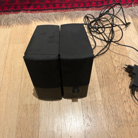 Bose högtalare i grå färg med volymkontroll och hörlursuttag. Högtalaren är avsedd för ljuduppspelning och ansluts till dator eller annan ljudkälla via sladd 3,5 mm. Fantastiskt ljud!