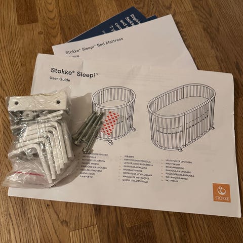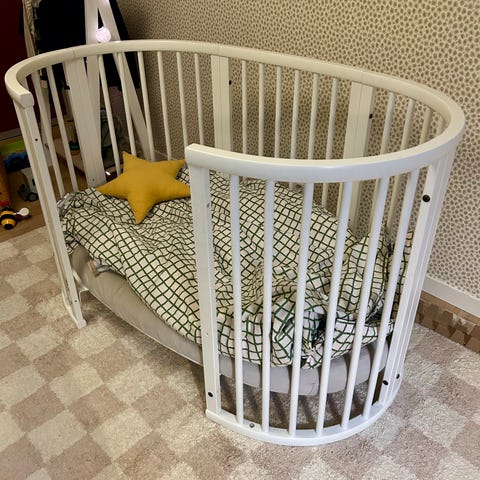 Stokke Spjälsäng Sleepi i vit, inklusive madrass, skena till sänghimmel och sänghimmel - allt original från Stokke.
