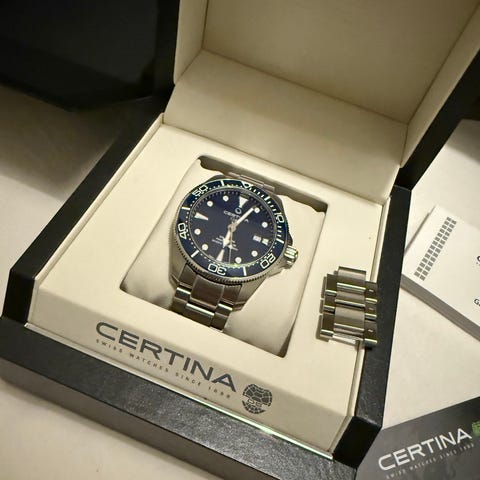 Certina unisex klocka med svart urtavla och mesh-armband i rostfritt stål. Klockan har en roterande bezel och transparent baksida som visar urverkets mekanism. Designad för dagligt bruk och kan passa olika tillfällen.