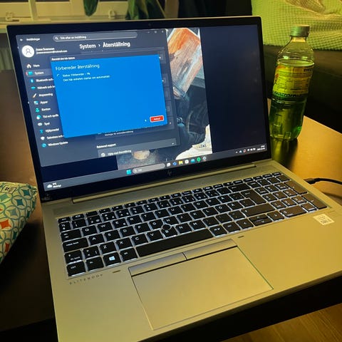 HP bärbar dator i silverfärg. Enheten har ett fullt tangentbord och en stor pekplatta. Designen är enkel med HP-logotyp på locket.