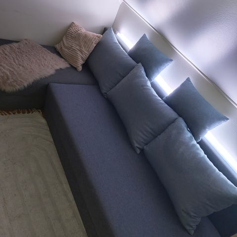 Bäddsoffa med förvaring, bra skick, sovdelen aldrig använd. Smart förvaring för ex. täcken och kuddar. Hel och ren, inga skador på tyget.