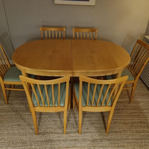 Matsalsgrupp utan kvistar i träet av modell "Kungsholm" och 6 stolar modell "Birka" med klädd sits i massiv björk. Efter design av Carl Malmsten. Inköpta på Blombergs möbler i Fjärås.