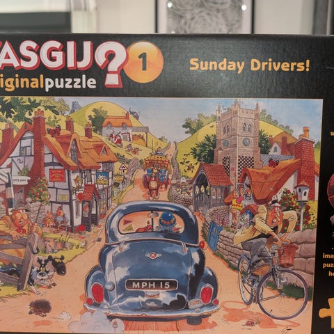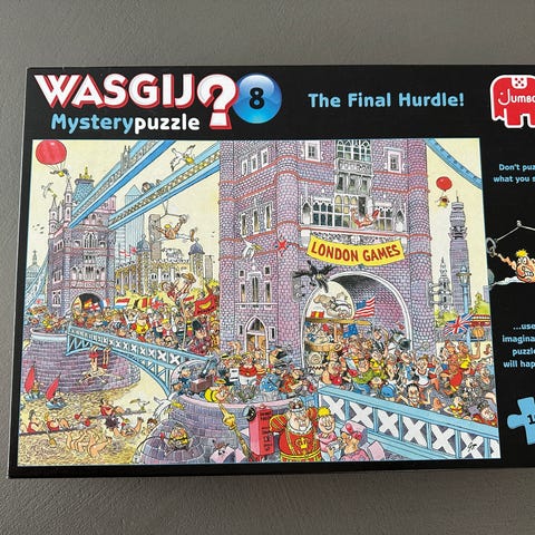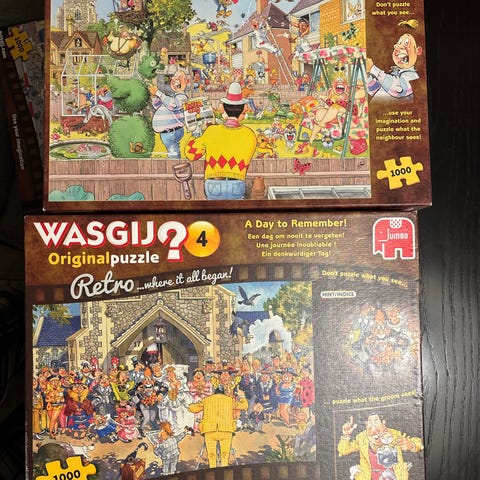 Wasgij 5 Mysterypussel med retro tema. Pusslet föreställer en scen med flera karaktärer i en kafémiljö, illustrerat i en tecknad stil.