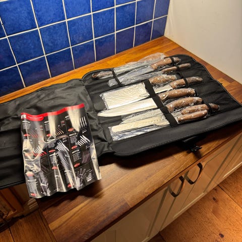 Kockknivset med 8 delar inklusive brödkniv, kockkniv, skalkniv, grönsakskniv, filékniv och köttkniv. Bladen är tillverkade i rostfritt stål och handtagen är av metall. Setet levereras i ett fodral för förvaring och transport.