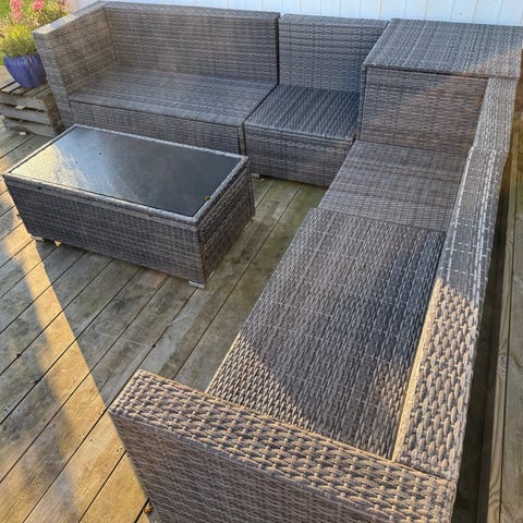 Soffa utomhus, loungemöbel från IKEA i svart konstrotting. En hörndel och två delar med ryggstöd samt en del utan ryggstöd. Varje del är 62 cm bred.