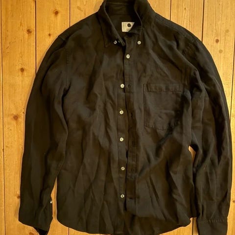 Filippa K skjorta i storlek 50, mörkgrön färg och tillverkad i materialet lyocell (Tencel). Modell: Zachary. Skjortan är avsedd för herrar och har en klassisk design med knäppning fram och en bröstficka. Nypris: 1500 kr.