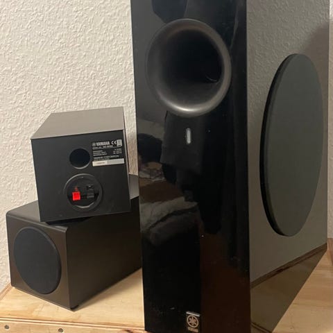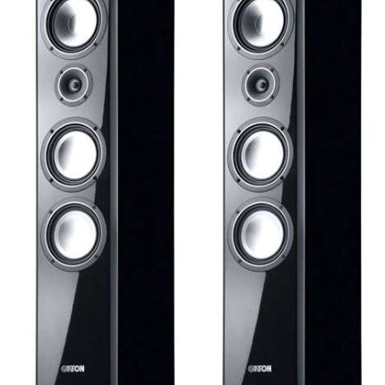 Högtalarpaket av märket Andersson model HIS 3.1 bestående av två golvhögtalare, en centerhögtalare och fyra surroundhögtalare i svart pianolack.