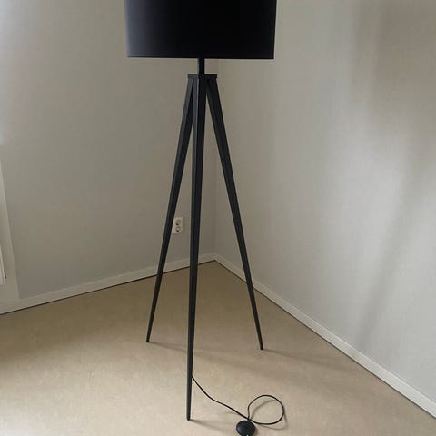Golvlampa med svart metallstativ och justerbar höjd. Lampan har en rund lampskärm och en sladd med strömbrytare. Passar för allmän belysning i olika rum.