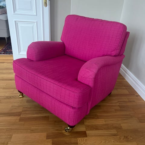 Trevlig fotölj i behov av lite kärlek, med lite nytt tyg har den många år kvar. Vart den kommer ifrån ser man på bild 2.