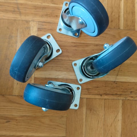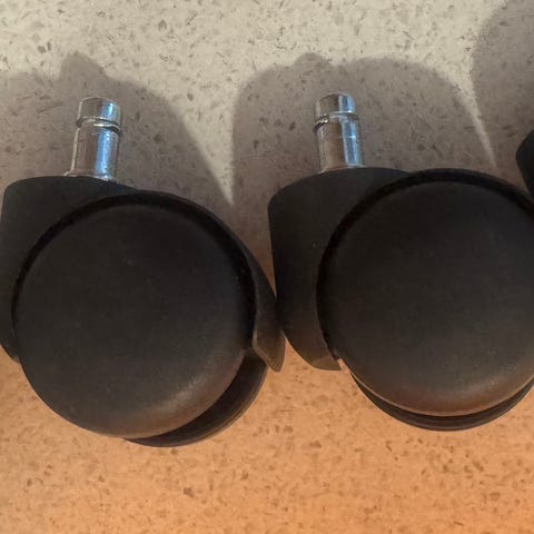 Säljer 5st låsbara plasthjul till gaming/skrivbordsstol då de ej passar min nya skrivbordsstol (Ikea Marcus), se bild 4 för diameter på inpassningen. Dessa funkar perfekt om du har lutande golv eller vill hålla stolen på plats när du spelar med racingratt och pedaler.