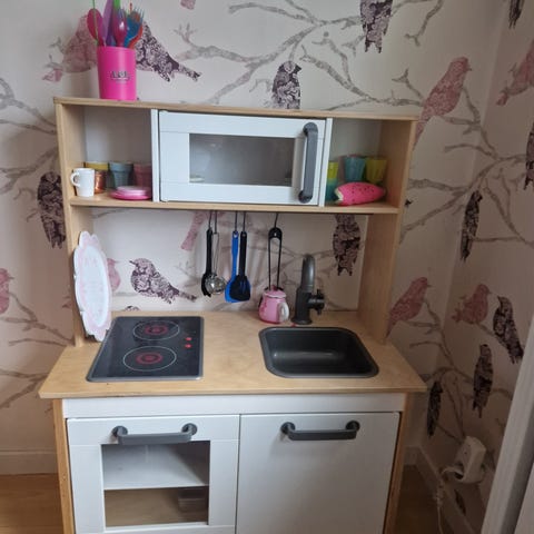 IKEA barnkök i trä med blå och naturfärgade detaljer. Inkluderar spis, ugn, diskho och öppna hyllor samt olika tillbehör som tallrikar, koppar, tekanna, brödrost, tårtset och kaffeservis. Passar för barnlek och rollspel. Ena hyllan längst ner på köket har en liten spricka
