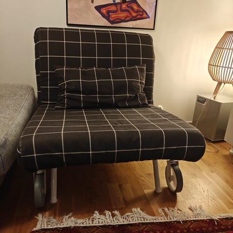Säljer en IKEA sittpall/fåtölj som fälls ut till säng. Perfekt som extra sovplats, gästsäng eller kompakt lösning i mindre bostad.