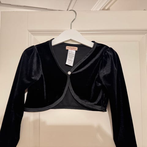 H&M bolero för flicka i storlek 92. Färgen är beige och materialet består huvudsakligen av bomull med inslag av polyester och metalltråd. Plagget har lång ärm och är avsett för barn. Perfekt till julafton och nyår. Tror den är använd 1 gång. Hittar inget att anmärka på.