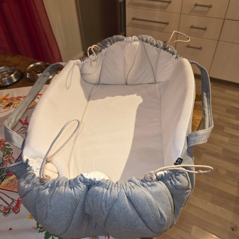 En beige Najell sleepcarrier. En tidigare modell motsvarande denna: https://najell.com/sv-se/p/sleepcarrier-x-oat-beige
