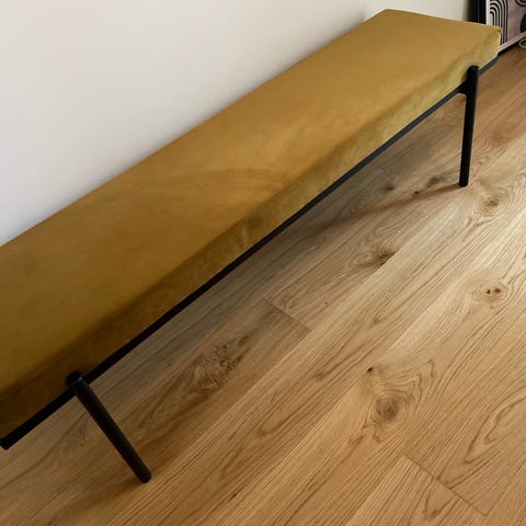 Sänggavel, lampa, fåtölj, matta och sittbänk