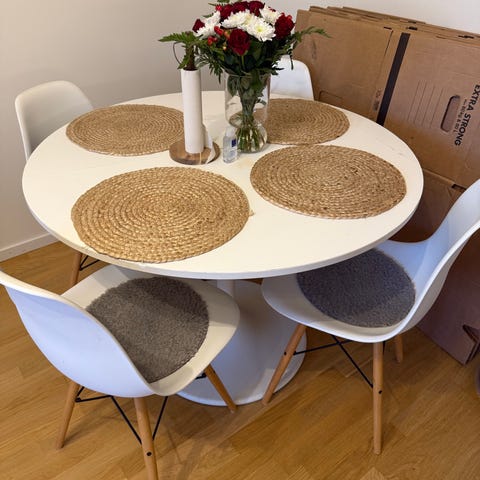 Matgrupp bestående av ett runt vitt bord (D=100 cm) med en central pelarfot i metall och fyra vita stolar med kromade ben. Stolarna har en klädd sits och ryggstöd i vitt fusk-skyn. Passar för vardagsrum eller matsal.
