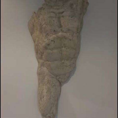 Skulptur föreställande en man i sittande ställning med knäna uppdragna och huvudet nedböjt. Skulpturen har en texturerad yta och en metallisk, brunaktig färg.