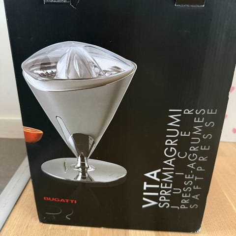 Bugatti VITA citruspress i rostfritt stål med en transparent presskopp. Elektrisk modell med sladd. Designad för att pressa citrusfrukter.