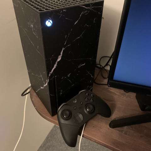 Säljer ett Xbox Series X med diverse tillbehör. Inkluderar konsolen, tre handkontroller och ett headset.