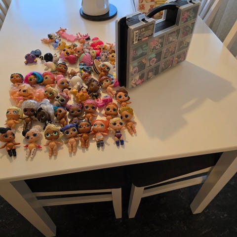 L.O.L. Surprise docka med olika kläder och accessoarer. Setet inkluderar dockor med färgglatt hår, kläder i olika mönster och färger samt en garderob med hängare och extra tillbehör som glasögon och väskor.
