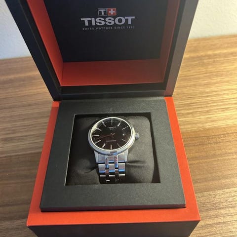 Inköpt 21/10-25, aldrig använd. Tissot Automatisk herrklocka med svart läderarmband och genomskinlig baksida som visar urverkets rörelse. Läderarmbandet har snabbknäppning. Modellnr. : T006.407.16.033.00.
