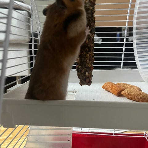 Handtam hamster. Springer i sitt hjul. Sitter gärna i handen och äter godsaker. Pigg och trevlig! Bur o tillbehör ingår
