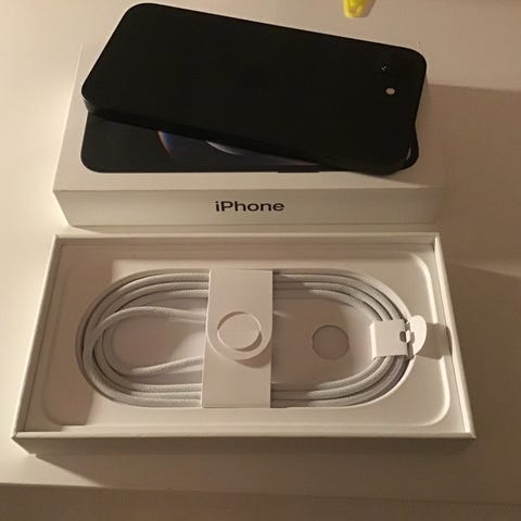 Säljer en iPhone 16e (svart, 128 GB) som är köpt på Elgiganten.