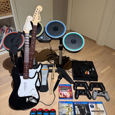 Sony Playstation 4 spelkonsol. Inkluderar flera spel: Battlefield, The Sims 4, Black Ops 3, Call of Duty, Just Dance 2019, Watch Dogs Legion, Avengers, Mafia, Minecraft PlayStation 4 Edition, Spider-Man med flera. Spelkonsolen är svart och klar för användning.