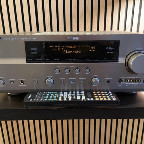 Yamaha RX-V671 AV-receiver med flera anslutningar på baksidan för ljud- och videoutrustning. Enheten har en svart och silverfärgad design med reglage och knappar för olika funktioner på framsidan. Receiver är avsedd för hemmabio och ljudsystem. Den är från 2013 och jag är enda ägaren. Det fungerar och säljs med tillhörande fjärrkontroll som jag i princip inte använt på senare år, eftersom mobilappen är så smidig att använda. Mitt pris 600kr.