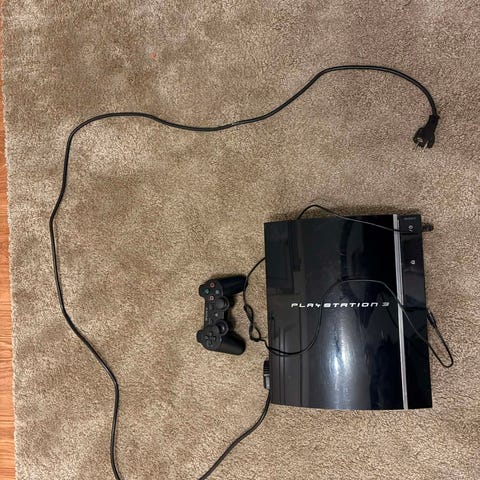 Playstation 3 med två handkontroller i svart och vitt, spelet "littel big planet " följer också med!