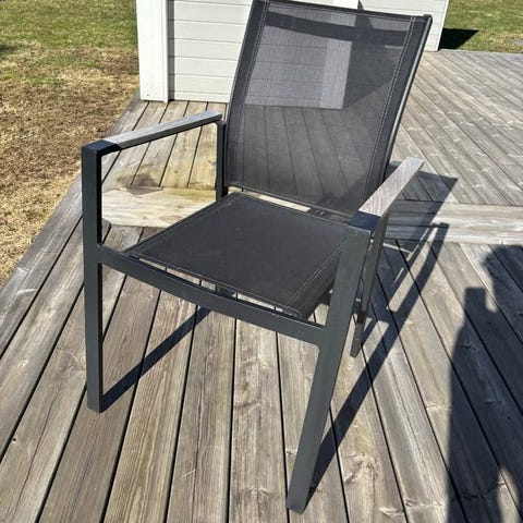 Säljer 8st utestolar i vitt pulverlackerad aluminium och beiga sittdynor. Stolarna är inköpta i våras och har knappt använts. Har aldrig fått utstå regn eller snö då det alltid funnits ett överdrag över matgruppen.