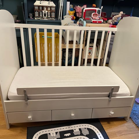Bopita spjälsäng i vitt med klassisk design och stabil ribbkonstruktion. Passar vanligtvis standardmadrass (60×120 cm). Begagnat skick med normalt slitage – några mindre märken/nagg i lacken på hörn/ben (se bilder).