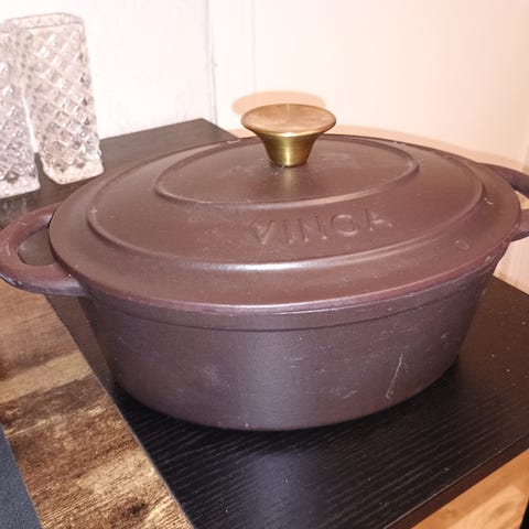 Stenfors gjutjärnsgryta av Anders Petter. En gedigen gryta (emaljerad) som passar både långkok och vardagsmat. Storlek 2,8- 3 l.