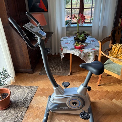 Kayoba träningscykel med digital display och pedaler. Utrustad för inomhusträning med justerbara handtag och stabil konstruktion.