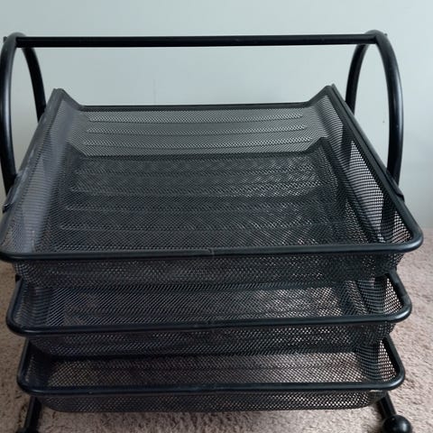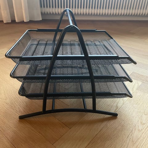 IKEA Meshfack är en organiseringslösning med tre fack, tillverkad i metall med ett nätmönster. Facken är utformade för att hålla papper, dokument eller andra kontorsmaterial organiserade. Produkten är grå i färgen och har handtag på sidorna för enkel hantering.