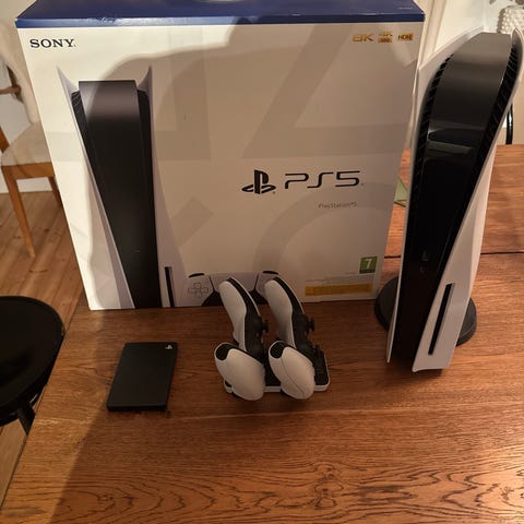 Sony Playstation 5 är en spelkonsol med avancerad grafik och snabb prestanda. Den har en vit och svart design och levereras med en trådlös handkontroll.