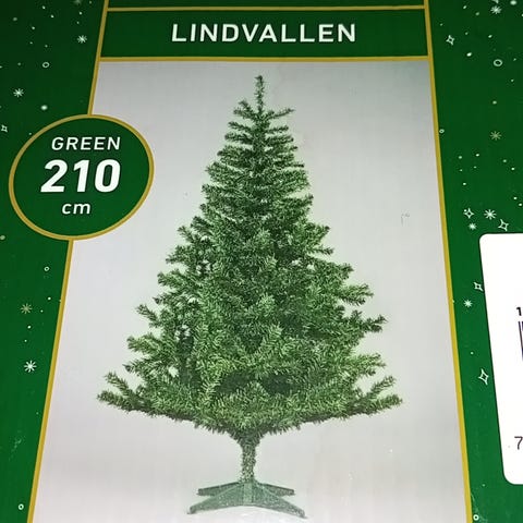 Verklighetstrogen julgran av plast, H=220cm. Ljusslinga ingår. Inköpt inför förra säsongen men aldrig blivit pyntad.