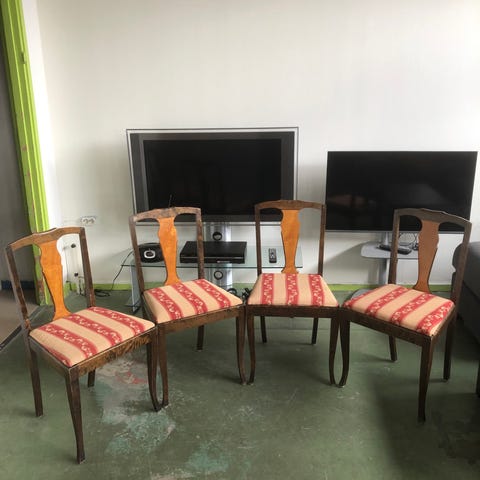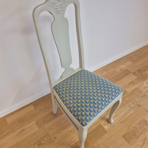 En stol har en fläck, se bild. Vadderad rygg och sits. Sitthöjd är ca 48cm. Finns två katter i hemmet men stolarna har stått i ett förråd så de har inte varit i kontakt med dem. Behöver bli av med dem