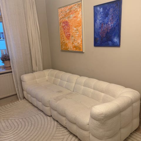 Soffan väl använd, dragkedja funkar ej (syns dock inte) men helt ok om man lämnar in typ för tvätt. Fåtöljen helt ok skick.