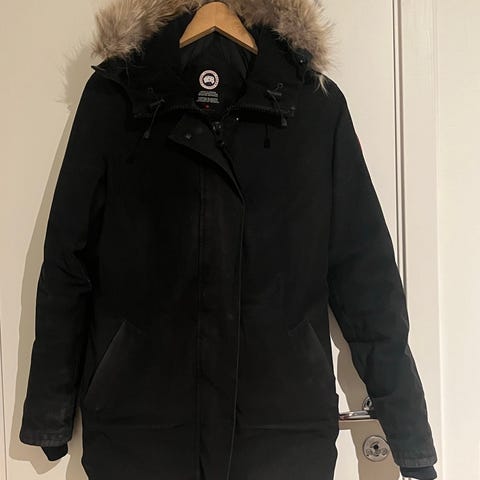 Svart Canada Goose Trillium Parka med pälskrage. Jackan har en ikonisk logotyp på ärmen och praktiska fickor.