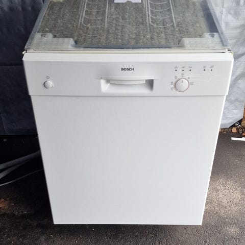 Bosch underbyggd diskmaskin, modell SuperSilence. Vit färg och inbyggd design för installation under köksbänk. Utrustad med flera korgar för effektiv diskning och bestickhållare.