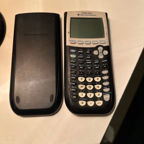 Texas Instruments TI-82 miniräknare i blå färg. Utrustad med grafisk display och flera funktioner för matematiska och statistiska beräkningar.