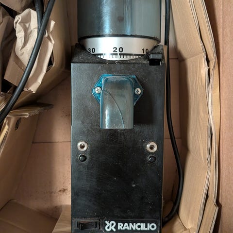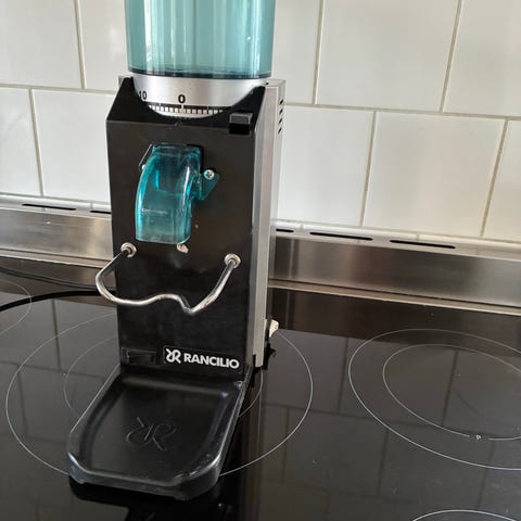 Rancilio Rocky Kaffeekvarn i svart färg. Utrustad med en blå behållare för kaffebönor och en justerbar malningsgrad. Designad för att mala kaffebönor för hemmabruk eller mindre kommersiella miljöer.