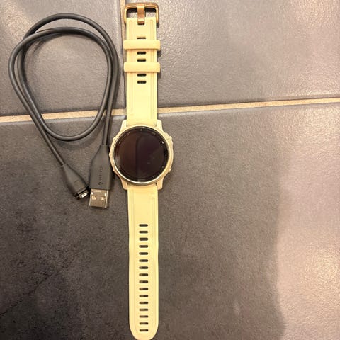 Garmin Fenix 5S smartklocka i svart färg. Klockan har en rund skärm och levereras med laddningskabel. Passar för användning som tränings- och aktivitetsarmband.
