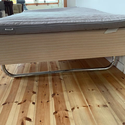 Traditionell spjälsäng, med alla skruvar o dyl, isärtagen.
