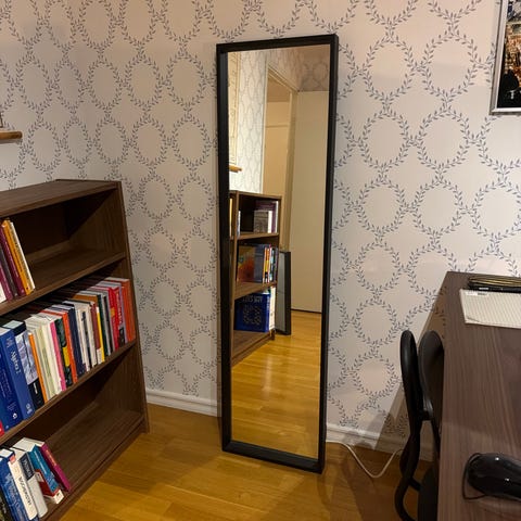 IKEA NISSEDAL Spegel med fyrkantig form och svart ram. Spegeln är avsedd för väggmontering eller placering på golv och kan användas i olika rum för att reflektera ljus och skapa en känsla av rymd.