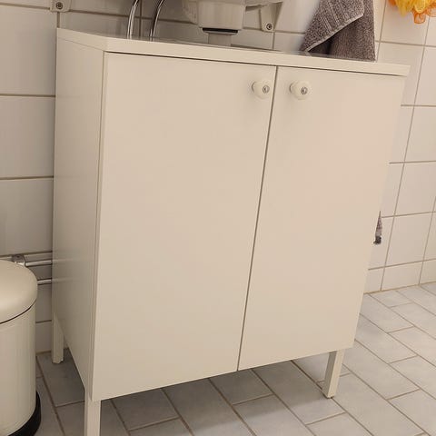 Vit skåp med en dörr och två inre hyllor för förvaring. Skåpet är tillverkat i vitt material och lämpar sig för användning i badrum