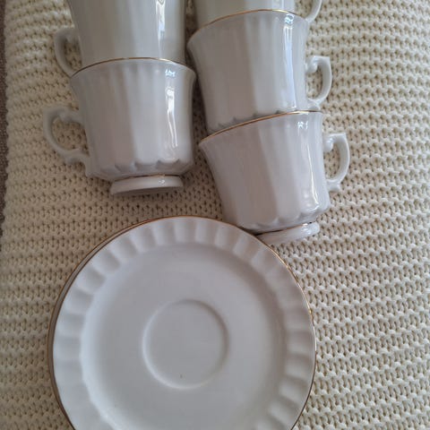 Tekanna och koppar set i rosa porslin med gulddetaljer. Setet inkluderar en tekanna och flera koppar med fat. Designen är enkel med dekorativa guldfärgade handtag och kanter.