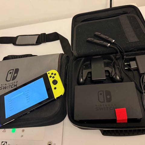 Nintendo Switch spelkonsol med de klassiska Joy-Con-kontroller i röd och blå färg.